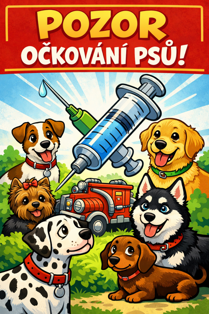 MVDr. Holomek bude v sobotu 4. dubna 2026 od 9:00 do 10:00 hodin očkovat psy u kulturního domu. K dispozici bude roční vakcína proti vzteklině za 100 Kč a tříletá vakcína za 200 Kč.