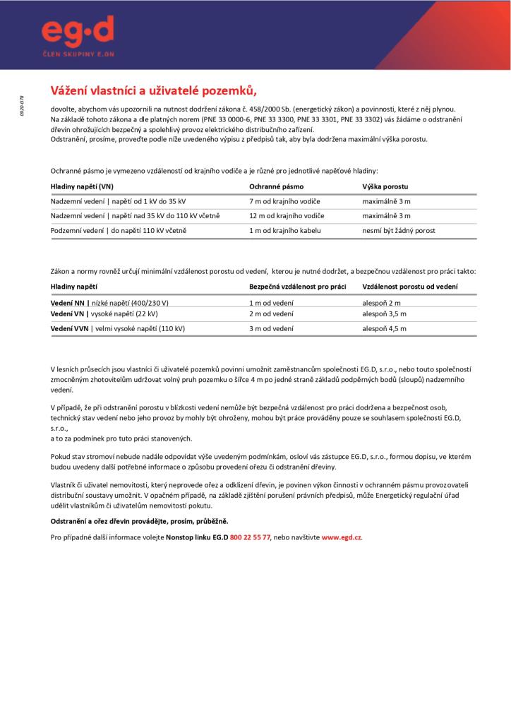 Vlastníci a uživatelé pozemků jsou ze zákona povinni udržovat vegetaci (dřeviny, stromoví a jiné porosty) v bezpečné vzdálenosti od venkovních elektrických vedení a zařízení. Tato povinnost vyplývá z Energetického zákona č. 458/2000 Sb., ve znění pozdějších předpisů. Upřesňující informace jsou uvedeny na plakátu Upozornění vlastníkům či uživatelům nemovitostí (pozemků) a v dokumentu Zásady pro provádění odstraňování a ořezů dřevin, o jejichž zveřejnění Vás žádáme.