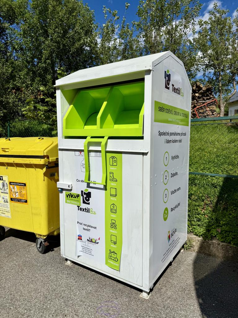 Kontejner na textil je umístěn za hasičskou zbrojnicí. Vývoz bude prováděn firmou TextilEco jednou měsíčně.