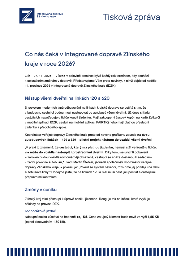 Tisková zpráva - Co nás čeká v Integrované dopravě Zlínského kraje v roce 2026