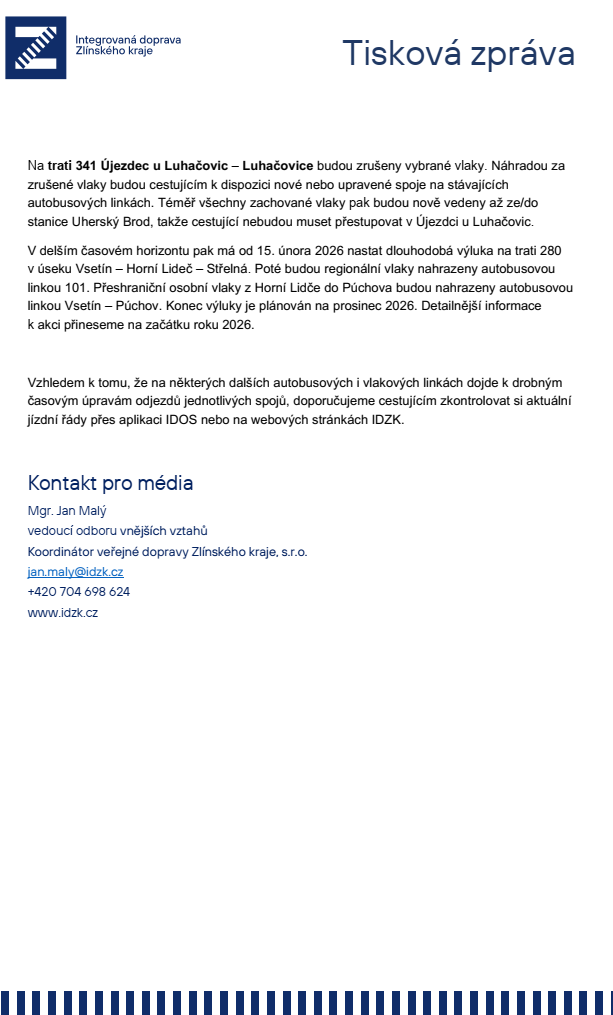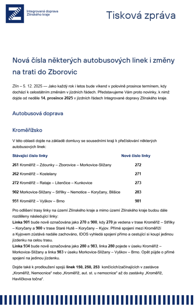 Aktuality z obce - TZ - Nová čísla některých autobusových linek i změny na trati do Zborovic