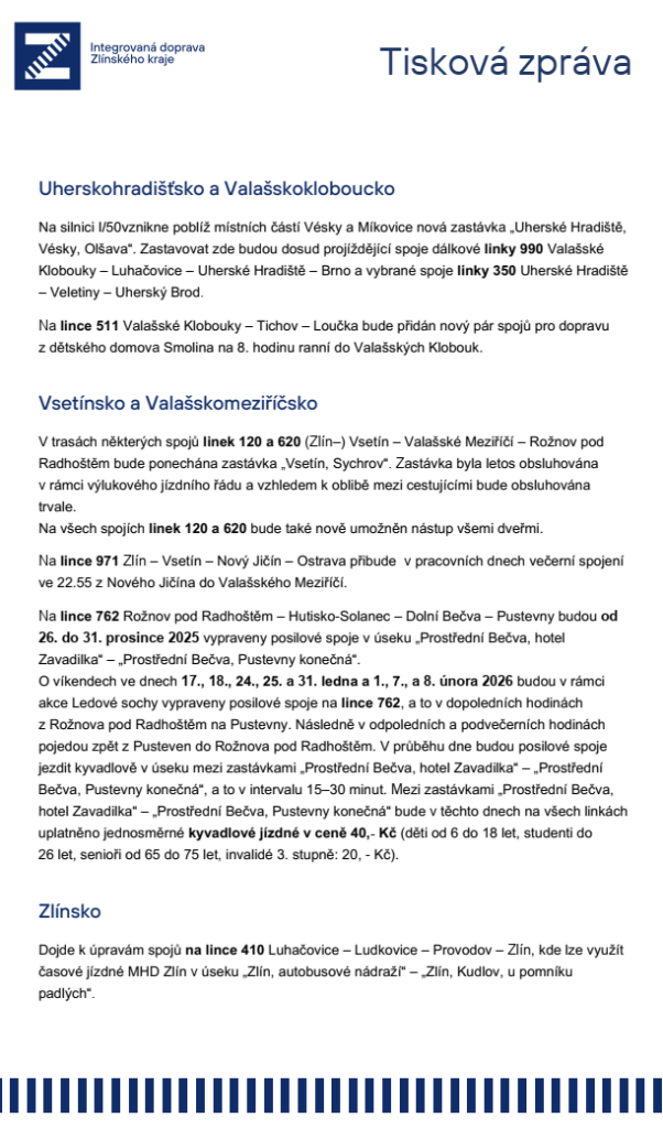 Změny v jízdních řádech Integrované dopravy Zlínského kraje, k nimž dojde od neděle 14. prosince 2025.