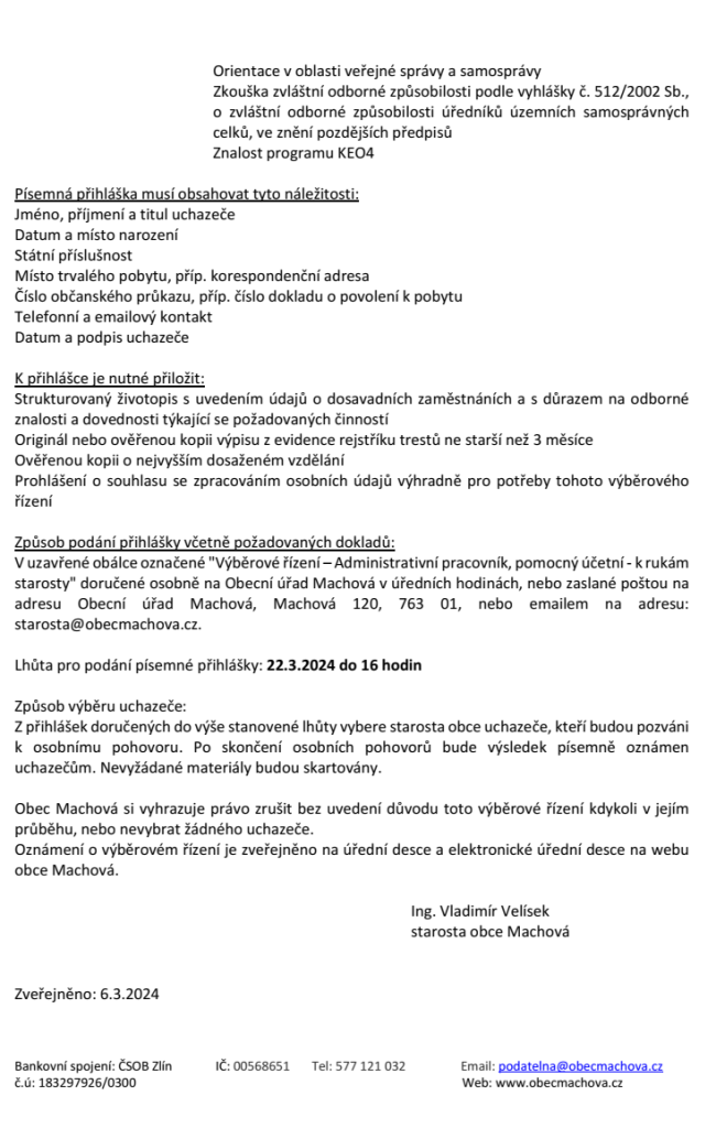 Starosta obecního úřadu Machová vyhlašuje výběrové řízení na osazení pracovní pozice: administrativní pracovník, pomocný účetní.