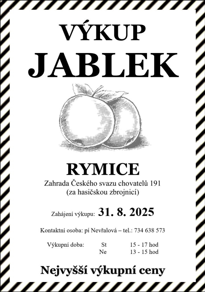 V neděli 31.8.2025 se zahajuje výkup padaných jablek. Výkup bude probíhat v Zahradě Českého svazu chovatelů 191 (za hasičskou zbrojnicí) v obci Rymice.