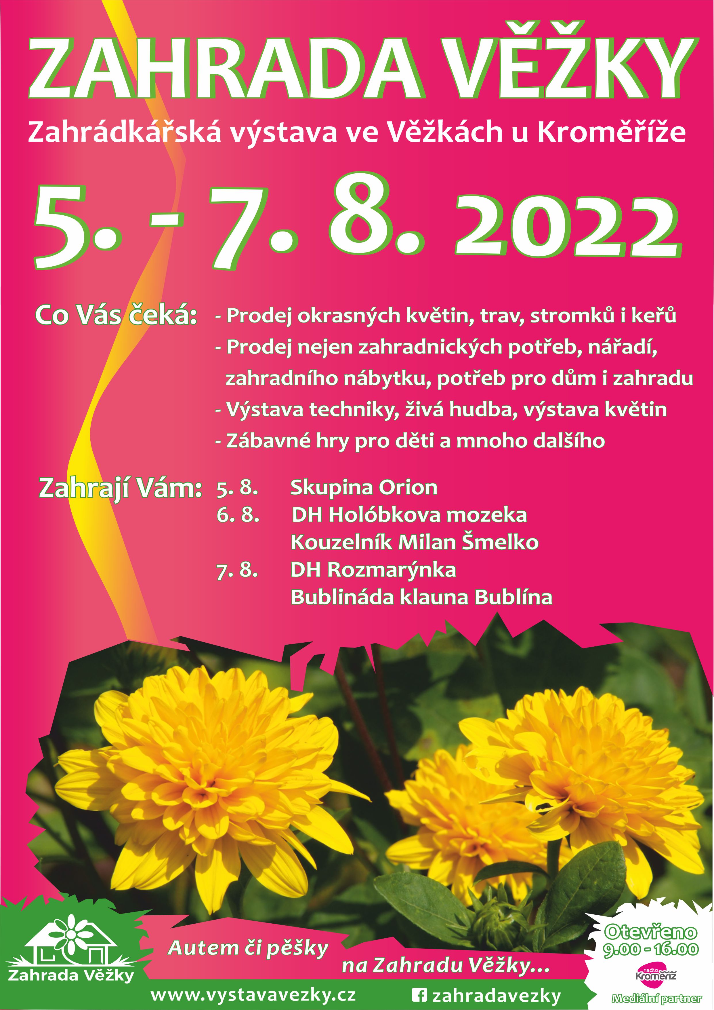 Srdečně Vás zveme na letní zahrádkářskou výstavu Zahrada Věžky, která se koná v termínu 5. – 7. srpna 2022, každý den od 9 do 16 hodin. Nakoupit si můžete květiny, stromky, potřeby pro dům i zahradu, řemeslné výrobky a něco dobrého na zub se také najde. Hudební vystoupení oblíbených kapel každý den